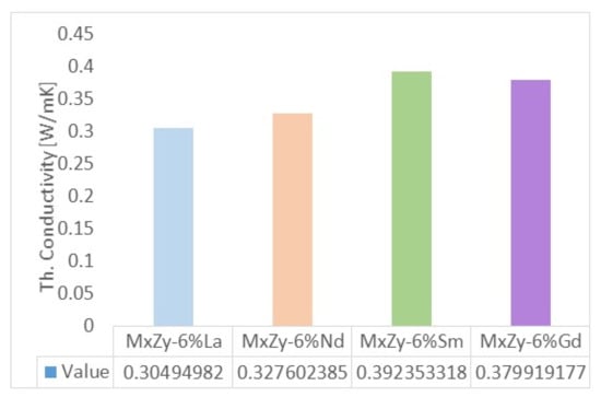 The thermal conductivity at room temperatures for ZrO2 co-doped with 8 wt.% Y and 6 wt.% Ln (Ln = La, Sm, Nd, Sm and Gd) are presented in Figure 6. The values obtained are in the range of 0.305 W/mK for La co-doped pellets to 0.38 W/mK for Gd co-doped pellets. The values are similar with those measured by Shi et al. for 4 wt.% RE2O3 (RE = La, Yb, Ce and Gd) and Y2O3 co-doped ZrO2 powder synthesized by a sol–gel method [61]. Thermal conductivities of RE-YSZ (RE = La, Yb, Ce and Gd) tetragonal powders were 0.5181, 0.4215, 0.4851, 0.5187 and 0.5347 W/mK, respectively. Other thermal properties are given in Table 5.