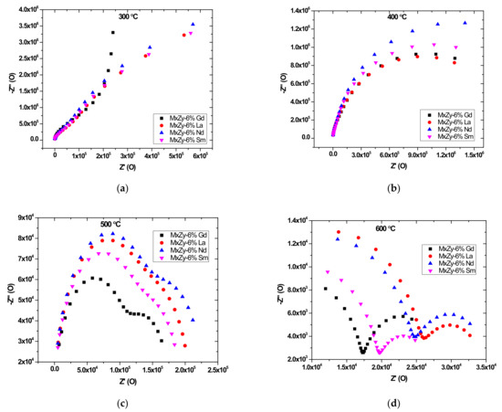(a) Nyquist plots for samples ZrO2 co-doped with 8 wt.% Y2O3 and 6 wt.% Ln2O3 at 300 °C; (b) Nyquist plots for samples ZrO2 co-doped with 8 wt.% Y2O3 and 6 wt.% Ln2O3 at 400 °C; (c) Nyquist plots for samples ZrO2 co-doped with 8 wt.% Y2O3 and 6 wt.% Ln2O3 at 500 °C; and (d) Nyquist plots for samples ZrO2 co-doped with 8 wt.% Y2O3 and 6 wt.% Ln2O3 at 600 °C.