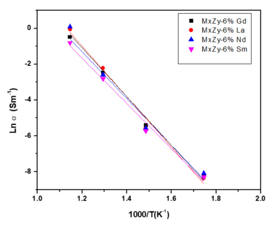 where Ea is the activation energy for electrical conduction, σ is electrical conductivity, σ0 pre-exponential factor, k is Boltzmann constant and T is temperature, from the Arrhenius plot presented in Figure 8. Activation energy calculated from the slopes of the least-squares fit of lnσ vs 1000/T in the temperature range 300–600 °C (573–873 K) are presented in Table 6.