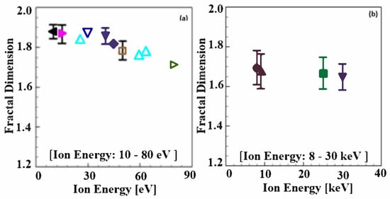 Figure 1 shows the fractal dimension of the examined irradiated W microstructure as a function of He/D irradiation energy. The reference sources and irradiation conditions for the microstructures are listed in Table 1. Note that the x-axis scales in Figure 1a,b are eV and keV, respectively. In Figure 1a, the mean fractal dimension of W microstructures irradiated by 10 eV energy is calculated as 1.878 and the value of fractal dimension decreases to 1.716 for the microstructures irradiated by 80 eV energy. While the values of the fractal dimension slightly increase with the increase in irradiation energy from 26 eV to 30 eV, the fractal dimension of the irradiated W microstructures overall decreases as the irradiation energy changes from E = 10 eV to E = 80 eV. In the case of high levels of irradiation, there are only four available microscopic studies on irradiated W microstructures that provide images with high enough resolution to allow for the fractal analysis [30,31,32,34]. The microscopic images from those studies were used for the fractal dimension calculations in the present study (Figure 1b). In the case of the W microstructure irradiated by irradiation energy from E = 8 keV to 30 keV, the fractal dimensions were found to be in the range of 1.583 to 1.764. The overall trend is a reduction in the fractal dimension with an increase in He/D irradiation exposure. The mean fractal dimensions of the microstructures in Figure 1b are calculated as 1.707, 1.677, 1.668, and 1.658 for E = 8 keV, 9 keV, 25 keV, and 30 keV, respectively. It is worth noting that, overall, in Figure 1, the fractal dimensions of the irradiated W microstructures decrease with the increase in irradiation energy. In addition, the sensitivity of the fractal dimension to the change in the irradiation energy becomes small for higher levels of the irradiation energy.