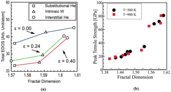 Ab initio simulation results of uniaxial tensile tests of W nanostructures reproduced from [22]. (a) Correlation between fractal dimension and total electron density of states (EDOS); (b) correlation between fractal dimension and peak tensile strength of W grain boundaries.