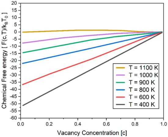 Hu and Heneager selected T = 1100 K as the reference temperature in their previous study [9,39] such that the free energy of the matrix phase decreases with decreasing temperature, while the free energy of the void phase is zero, independent of temperature. Such a selection was made based on the experimental and computational studies on the chemical free energy of the void phase [40,41,42].