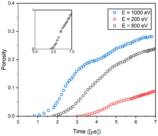 The increase in the porosity due to the consecutive formation of voids under He/D irradiation leads to embrittlement, which significantly affects the material’s properties. Seeking insight into the influence of irradiation on porosity evolution, the temporal evolution of the porosity was calculated as a function of the irradiation energy. Porosity is defined as the percentage of void space in a simulation domain. Figure 6 shows the temporal evolution of porosity in the examined W polycrystalline for three different irradiation energies: E = 200 eV, 800 eV, 1000 eV. As shown in Figure 6, the incubation time for void nucleation increases with decreasing irradiation energy. While void phases start to form after the incubation time of t = 0.8 μs in the case of irradiation energy of E = 1000 eV, the incubation time increases to t = 3 μs for irradiation energy of E = 200 eV. As time progresses, voids start to be nucleated and grown. The competition between the surface energy and the chemical potential energy difference between solid and vacancy phases yields an energy barrier for void nucleation. Localized vacancies in the material system interact with each other and aggregate into vacancy clusters. If vacancy clusters grow large enough to overcome the free energy barrier for void nucleation, small stable voids are nucleated and grown [46]. In Figure 6, the trend of porosity evolution follows the Kolmogorov–Johnson–Mehl–Avrami (KJMA) equation. Transformation kinetics where nucleation and growth occur can be typically described by the Kolmogorov–Johnson–Mehl–Avrami (KJMA) equation [47,48,49], which is expressed as follows: