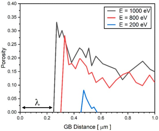 The porosity as a function of distance from GB for three different irradiation energies: E = 200 eV, E = 800 eV, and E = 1000 eV. The width of void denuded zone is marked as λ in the figure.