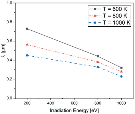 Grain Boundaries (GBs) are known as an efficient sink for the annihilation of irradiation-induced point defects and defect clusters [51,52]. As a result, the vacancy concentration near GBs is lower than the one in the interior of the grains. Because the vacancy concentration near GBs does not typically increase to the critical vacancy concentration for voids to nucleate and grow due to the decrease in supersaturation, the void-denuded zone (VDZ) forms near GBs. Figure 7 shows the porosity as a function of distance from GB for three different irradiation energies: E = 200 eV, 800 eV, 1000 eV. In Figure 7, the VDZ where porosity is zero is observed in the region near GB for all examined irradiation energies. As shown, porosity curves have a peak in the vicinity of the VDZ and decrease overall as it decreases from GBs. The width of VDZ (Wvdz) is found to decrease with increasing irradiation energy. Wvdz for E = 200 eV is calculated as 0.44 μm while Wvdz for E = 800 eV and E = 1000 eV is calculated as 0.32 μm and 0.24 μm, respectively.