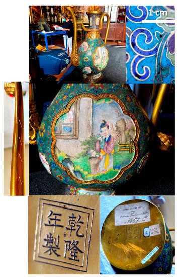 On-site pXRF analysis of the enameled ewer (F1467C) and details of the décor (cloisonné and painted enamels); the bottom face exhibits an engraved Qianlong reign mark (bottom left, basin: Qian long nian zhi; right, ewer; Da qing Qian long nian zhi). Note the welding traces along the spout (arrows).