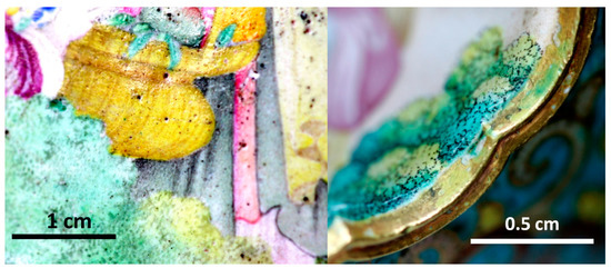 The cloisonné décors consist of multicolor flowers (blue, yellow, red and green) on turquoise and blue backgrounds. The background is turquoise for the belly as usual but blue for the foot and the neck. The quality of the cloisonné décor is also exceptional by its surface with less bubble (Figure 1) than in the Kangxi incense burner (Figure 2). The painted décors of the small medallions depict flowers, personages and/or landscapes (four medallions on the neck, six on the central part and four on the foot) [57,58] and one large medallion on each face depicts women with a child in a garden. The fineness of the design and the variety of color tones demonstrate great technical mastery. The decor style appears to be a hybrid, combining characteristics of Chinese decor (shape of the houses) and European decor (women’s faces, basket of flowers, belt and drape of the dress). The enamels are rather matt (Figure 1), except some yellow areas (Figure 3, this should involve a lower melting temperature of the enamel colored in yellow), giving the impression of a decoration on paper, which is unusual for an enamel decoration. The artist used the stamping of the metal support of the medallion for some part of the decoration (window of the pavilion, garden fence). Burrs and drips of the enameled decor on the edge of the medallions are observed (Figure 3).