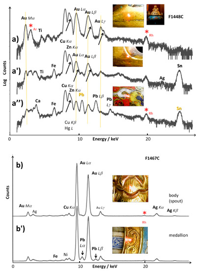XRF spectra recorded on the metal parts of the incense burner (a,a′,a″) and the ewer (b,b′); the lightened spot on the photograph shows the analyzed area: (a) rim, (a′) rim with gilding partially lost and (a″) cloison; (b) spout and (b′) medallion rim. Main XRF peaks are labelled; arrows indicate the contribution of Hg L peaks in the spectra a, a′ and a″. Red stars (*) indicate the contribution of the instrument (Rh peaks). The logarithmic scale on the top spectra makes more visible the contribution of minor elements.