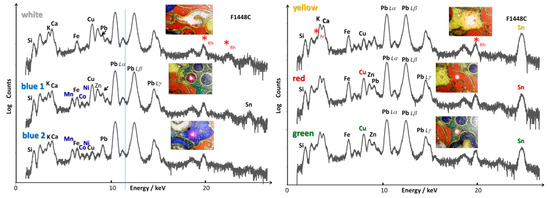 Table 2 and Table 4 compare the metal content (net count areas) of the blue, yellow and green enamels extracted from the fitting, respectively. These compositions are only comparative due to the intrinsic heterogeneity of the enamels, the contamination by neighboring phases and uncertainty of the method. The variable penetration depth as a function of the photon energy makes that the measured volume is very different as a function of the element [52,53,83,84]. Nevertheless, the comparison of measurements made on similar blue spots shows consistency, taking into account the contribution of neighboring phases.