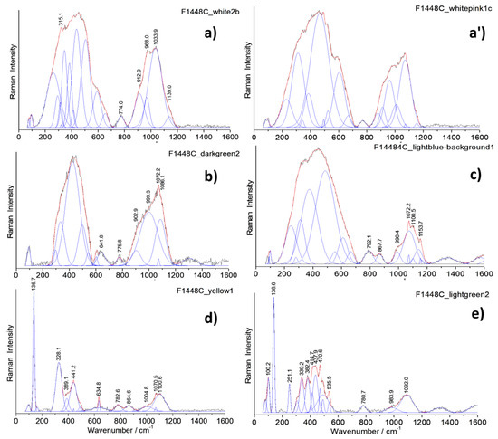 Representative Raman spectra recorded on the cloisonné enamels of the incense burner (baseline subtracted): white (a), white-pink (a′), dark green (b), turquoise (c), yellow (d) and light green (e) areas. Gaussian and Lorentzian components used to separate the contribution of the crystalline pigment from that of the glassy matrix are shown.