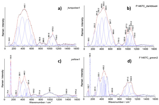 Representative Raman spectra recorded on the cloisonné enamels of the ewer (baseline subtracted): turquoise (a), dark blue (b), yellow (c), and green (d). Gaussian and Lorentzian components used to separate the contribution of the crystalline pigment from that of the glassy matrix are shown.