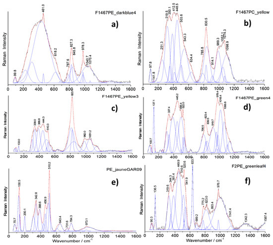 Representative Raman spectra recorded on the painted enamels of the ewer (baseline subtracted): dark blue (a), yellow (b,c,e), and green (d,f).