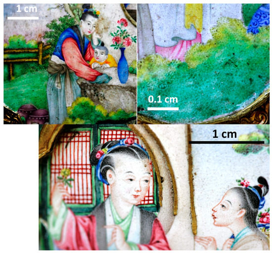 The observation of the painting technique of the Qianlong ewer at high optical magnification (Figure 11) shows dotted touches of color, which is the technique of the miniaturists in the 18th century [92,93]. Miniaturists made drawing and painting at a small scale (a few cm2) representing landscapes or scenes including many personages, country or castle views, etc. They used lenses, fine nibs and brushes made of some polishes to achieve these miniature decorations. It is reasonable to think that similar techniques were used to paint the decoration of the enameled ewer. Only for some parts such as the hair of the human figures, the brush touch was used. The analysis of a fraction of a green paint touch is shown in Figure 10f. Here, the spot analyzed in Raman with the 200× objective is about more than ten times smaller than the paint point visible in the zoom image (Figure 11). However, in this spot at least four crystalline phases (cassiterite, lead pyrochlore type 3, wollastonite, lead arsenate apatite plus amorphous carbon) and the amorphous silicate matrix are identified in the Raman spectrum. This confirms the use of a color palette prepared by prior mixing of coloring agents to obtain a wide range of colors, as practiced in European easel paintings, in accordance with the archival texts which say that about thirty colors became available for painted enamel decorations prepared by the imperial workshops [6,94,95].