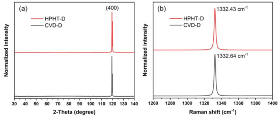 Figure 2a shows the XRD patterns of the samples measured at 300 K. Both the HPHT-D and CVD-D are (100) oriented single crystals with no obvious difference. According to the Raman spectra in Figure 2b, the FWHM of HPHT-D and CVD-D is 1.91 and 1.78 cm−1, respectively. The results demonstrate that both the samples have high crystal quality. The larger FWHM value could be attributed to nitrogen impurities in the HPHT-D sample [26].