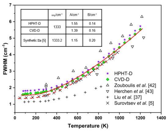 Multiple factors can change the Raman line shape, such as crystal orientation and gas conditions during the growth process [38,39,40]. Studies have indicated that the introduction of N can increase the FWHM value, and hence, shorten the lifetime of Raman phonon [26,41]. From Figure 6, the FWHM of the HPHT-D and CVD-D samples at 80 K are 1.587 cm−1 and HPHT-D 1.801 cm−1, respectively. Furthermore, the difference between them is very small and remains near constant at elevated temperature. Several sets of data from references are also displayed in Figure 6. Most of the previous research [37,42,43] focused on natural type IIa diamonds. The sample by Surovtsev et al. [5] was from a synthetic IIa diamond, which show similar result to our CVD-D sample. The FWHM of the Raman peak represents the inverse optical phonon lifetime, its temperature dependence shows the anharmonicity of the lattice vibrations. Anharmonicity causes the zone center optical phonon to decay into other phonons that conserve energy and momentum. The cubic term to second order in potential energy means the three-phonon process which makes an optical phonon decay into a pair of acoustic phonons, while the quartic term implies four-phonon interaction causing the annihilation of an optical phonon into three acoustic phonons [7,10,11,44]. For diamond, both the three- and four-phonon processes contribute to FWHM. Assuming that the decayed phonons have the same frequency, the temperature dependence of FWHM could be expressed as Equation (3) [7]: