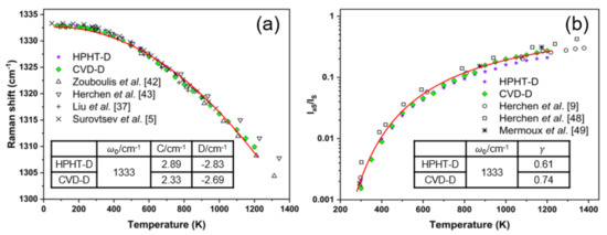 Raman shift and the intensity ratio of anti-Stokes line (IaS) to Stokes line (IS) are also temperature-dependent (see Figure 7a,b). At low temperatures, the phonon frequency is nearly constant. It can be seen that the temperature-dependent law of the zone center optical phonon frequency and IaS/IS is very consistent between HPHT-D and CVD-D. This suggests that N impurities have a faint effect on the temperature dependence of Raman shift and IaS/IS. Similar to FWHM, the model of Raman shift versus temperature could be given by Equation (4) [7]: