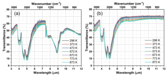 The high-temperature IR transmittance of (a) HPHT-D and (b) CVD-D measured in the air.