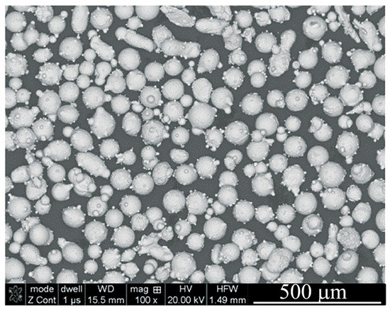 In order to evaluate the possibility of using the LENS technology for the repair of gas turbine blades, Stellite 6 powder purchased from LPW Technology LTD (Gloucester, UK) was used as a batch material. The feedstock material was characterized by a spherical shape and a wide size range of particles (45–150 μm) (Figure 1). Before the deposition process, the powder was dried at a temperature of 200 °C for 24 h under a protective inert atmosphere (a content of oxygen and water vapor was below 0.1 ppm). The brand new turbine (non-exploited) blade made of X22CrMoV12-1 steel was used as the substrate during the laser deposition process. The Co-6 powder was deposited by using the LENS technique on a substrate with dimensions of 15 mm × 150 mm × 10 mm, which was cut by a wire electrical discharge machining (WEDM, ZAP B.P., Końskie, Poland) from the new turbine blade. Then, the substrate was degreased in an ultrasonic bath, dried under a low vacuum for 24 h, and finally blasted.