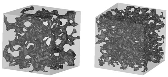 Sintered and Platonic foam models with different porosities were generated (see Figure 6) to analyze the influence of the morphology on the . For the Platonic foams, the diameter of the struts was varied to adjust their porosity so that it was similar to the values of the sintered foams, as shown in Table 1. All of the Platonic foam models were adjusted to a total length of 10 mm to match of the sintered foams.