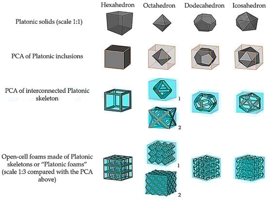Platonic solids are regular polyhedrons with identical faces and equal vertex angles. The polyhedrons that were used in this work were hexahedrons, octahedrons, icosahedrons and dodecahedrons [14]. An important feature of these solids is that they can be inscribed in a cube enclosure, whose outer faces can be considered to be periodic boundaries (see Figure 3). This guarantees that these cubes, when juxtaposed, repeat the Platonic solids with the same spatial arrangement. In the case of octahedrons, two arrangements satisfy their periodicity: octahedron1 (the struts cross at the center of the cube faces) and octahedron2 (the struts cross at the center and corners of the cube faces). Throughout this article, these arrangements of Platonic solids will be referred to as the periodic cubic enclosure arrangement (PCA) of Platonic inclusions.