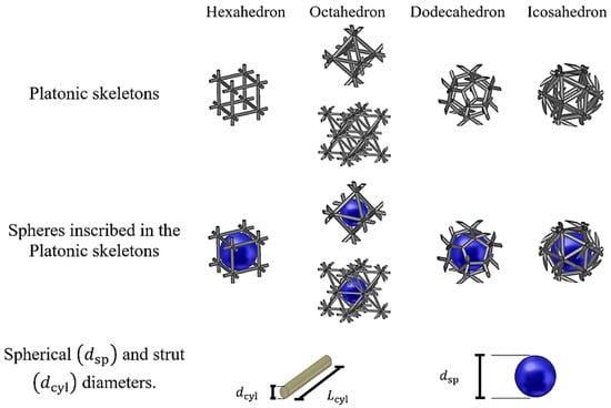 The cylinders at the edges of the Platonic solids form an interconnected network that is equivalent to the skeleton of open-cell foams with their struts and joints. However, such a simplification adds a geometrical defect (gap) at the vertices where the cylinders come across each other. These gaps can be easily filled using Boolean operations with a spherical triangle, as shown in Figure 4. In this way, a PCA of interconnected Platonic networks is obtained, which—upon replication in any direction (x, y or z)—forms the open-cell foams of Platonic skeletons that are referred to as “Platonic foams” (see Figure 3, bottom row). Their cylinders represent—by analogy—the struts of sintered foams. A sphere inscribed in the Platonic network—by analogy—is the equivalent of the cell of sintered foams. Moreover, since the geometries of these foams are regular, both their cylinders and spheres have constant diameters, and , respectively, as shown in Figure 5.