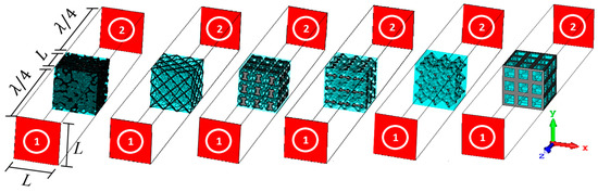 The simulation setup is shown in Figure 7. This approach is identical to the one reported elsewhere [7,10]. The boundary conditions are: normal electric () and magnetic () walls for the x- and y-axes, respectively; input (1) and output (2) are open boundaries with added space and non-reflective waveguide ports and a distance to the models equal to for the z-axis.
