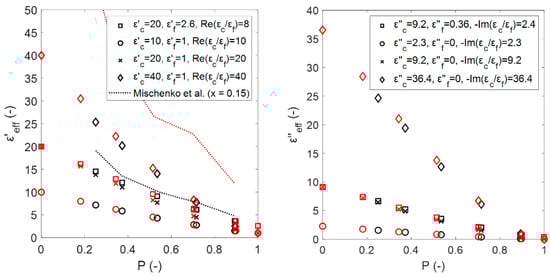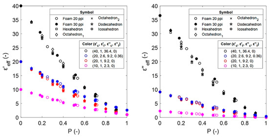Estimated effective dielectric constants (left) and effective dielectric losses (right) from numerical calculations for sintered and Platonic foams. The mixtures of the foams from Section 2.2 are identified by their corresponding properties , ).