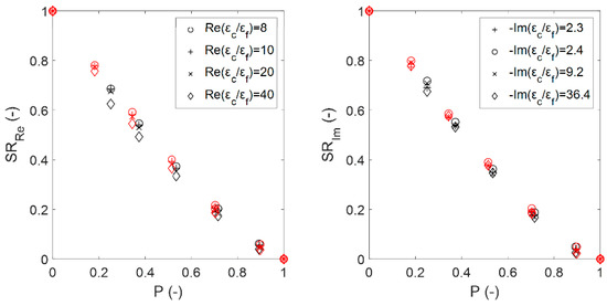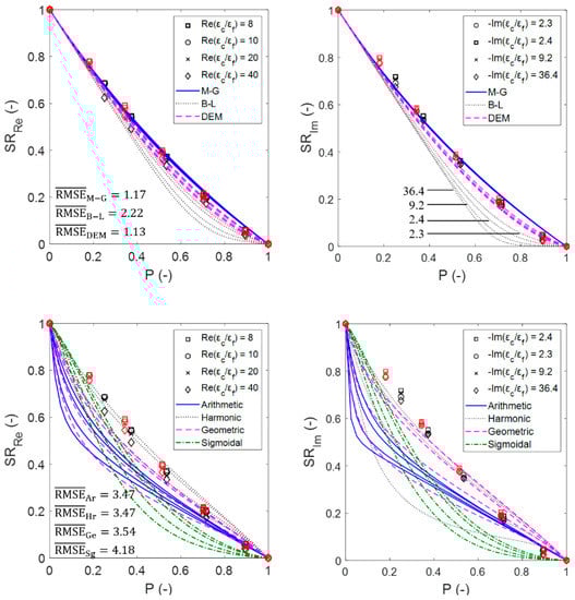 Real (left) and imaginary (right) susceptibility ratios of the EMA relations (upper row) and the probability distribution relations (lower row) compared with the calculated ratios from the numerical simulations for sintered foams for 20 ppi (black symbols) and 30 ppi (red symbols). The figure symbol corresponds to the complex dielectric contrasts of the foam mixtures introduced in Section 2.4, while lines illustrate the EMA relations predictions. The curves derived from the relations follow a descending order as increases (as illustrated in the upper right figure for the B-L relation).