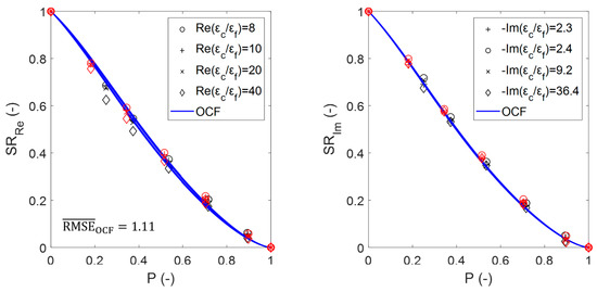 Figure 13 shows the susceptibility ratios of the estimated effective permittivity for the sintered foams (marked with symbols) compared to that obtained using the OCF relation (continuous data shown by lines), including the . Figure 13, as well as Figure 11, illustrates the agreement between the data that were obtained from the simulations and relations, which for the OCF relation even exceeds the estimations that were obtained with the DEM relation () and thus also for all of the other EMA relations and Platonic foams (see Figure A1).