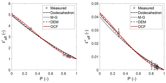 In Figure 14, (unknown bulk permittivity) is obtained from the mixing relations that were fitted to the experimental data using an iterative least-squares estimation. The dodecahedron, M-G and DEM relations show similar estimates but do also have a remarkably different trend compared with the OCF relation. This is due to the different approaches that are used to describe the microstructure of the mixtures (e.g., foams) between relations. All of the relations provide an acceptable estimate ) of the cordierite bulk permittivity ( at for 20 °C and 1 MHz [21] and at for 20 °C and 8.52 GHz [22]), assuming that the value must be between and and that this range remains practically constant with the same conditions that were applied in the previous study (100 °C, 2.45 GHz). A better estimation would be obtained by using more points that are equally distributed within the porosity.