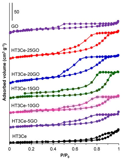 The specific surface area, the pore volume, and the pore size of the HT3Ce LDH, GO and HT3Ce-xGO hybrids are tabulated in Table 2, and their corresponding adsorption-desorption isotherms and pore size distributions are shown in Figure 1 and Figure S2, respectively. All the samples reveal type IV isotherms according to the IUPAC classification, characteristic of mesoporous materials. However, the neat HT3Ce LDH shows a H3-type hysteresis loop attributed to aggregates of plate-like particles giving rise to slit-shaped pores, while the neat GO shows a H4-type hysteresis loop associated with narrow slit-like pores, including some microporosity [43]. At the same time, for the LDH-GO composites, the hysteresis loop moves towards H2b-type, which corresponds to more complex pore structures [44].