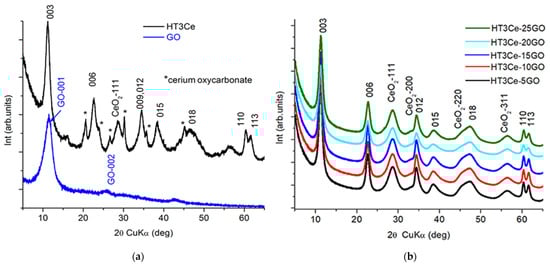 The diffraction patterns of the solid samples, namely hydrotalcites obtained in the presence of different amounts of GO, pure GO, and HT3Ce are illustrated in Figure 2. The XRD pattern of the HT3Ce displays a mixture of characteristic reflections of a hexagonal LDH phase with rhombohedral 3R symmetry (ICDD card no. 054–1030), and of a cubic cerianite CeO2–phase (ICDD card no. 034–0394). They are Miller indexed consequently in Figure 2a. Additionally, diffraction lines assigned to cerium oxycarbonate (Ce2(CO3)2O·H2O, ICDD card no. 044-0617), labeled (*) in Figure 2a, can be observed. The GO pattern shows the structure of a nano-graphene oxide (ICDD card no. 065-1528). The XRD patterns of all HT3Ce-xGO nanocomposites (Figure 2b) expose the same mixture of characteristic reflections of LDH and cubic cerianite CeO2 phases, with no additional impurity lines. The typical strong (001) basal diffraction peak of GO was not observed in all the nanocomposites. This could be attributed to the superimposed reflection with the (003) basal LDH peak and is also indicative of an exfoliation of the graphene sheets [46]. Apparently, the restacking of graphene sheets was inhibited by deposition of the LDH crystallites on the graphene sheets [47,48]. The structural data, the lattice parameters of the two phases, and their crystallite sizes are provided in Table 3. For the LDH phase, the crystallite sizes were calculated along two directions: perpendicular (D003) and parallel (D110) to the brucite-like layers, respectively. The data gathered in Table 3 show similar structural characteristics for all the samples. The CeO2 phase is structurally identical in all the samples, while the LDH-phase is more likely affected by the electrostatic interactions between GO and LDH during the synthesis [45,49]. As it can be observed, the crystallite sizes, in particular the coherence lengths in the layer-stacking direction (D003), were affected by the presence of GO. Indeed, the incorporation of GO led to the formation of larger LDH particles suggesting the involvement of the GO sheets as nucleating agents for the LDH phase formation [50]. The evolution in the HT3Ce-xGO series of the absolute intensities of the (110) line, exclusively related to the brucite-like layer, should go along with the decrease of the proportion of the LDH phase in the nanocomposites. This is the case, except for the inversion between the HT3Ce-20GO and HT3Ce-25GO samples, in line with the result obtained through textural measurements. Indeed, there is an obvious inverse correlation between the surface area and the I110(HT3Ce-xGO)/I110(HT3Ce-5GO) ratio (Figure S3), evidencing HT3Ce-5GO as the most “ordered” material, and HT3Ce-20GO as the most disordered one in this series. This order-disorder could be associated to the dispersion of HT3Ce on the GO sheets. HT3Ce-25GO appears to be more “ordered”, i.e., less dispersed, than HT3Ce-20GO likely due to GO restacking.