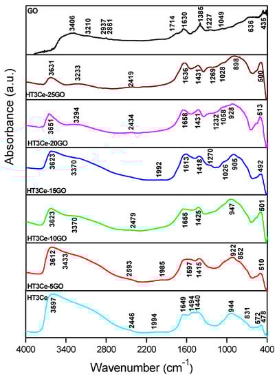 The DRIFT spectra of all the synthesized solids can be seen in Figure 3. The characteristics of the composites modified with GO were close to the HT3Ce structure, depicting the main layered phase. As the GO concentration increased in the hybrid solids, the stretching vibrations bands attributed to the OH groups present in the hydroxide layer of HT3Ce at 3587 cm−1 shifted towards larger values, namely 3612, 3623, 3623, 3651, 3631 cm−1, and their intensity also decreased.