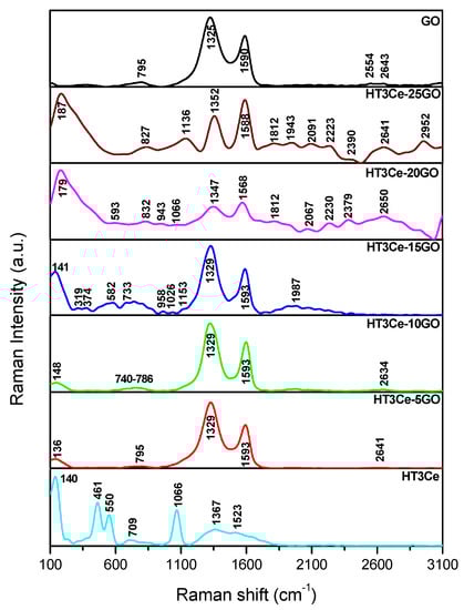 The presence of GO in all the HT3Ce-xGO composites was clearly evidenced by Raman spectra of the samples which are displayed in Figure 4. The spectrum of HT3Ce presented different bands, some specific to the LDH structure, namely a broad band characteristic to the lattice vibrations of the hydrotalcites at 140 cm−1, another one at 550 cm−1 attributed to stretching vibrations of the hydrogen bonds formed between the interlayer water and carbonate anions, and a band assigned to the symmetric stretching of the carbonate anion found at 1066 cm−1 [52]. In addition, a band was observed at 461 cm−1, characteristic to nanocrystalline CeO2 and some bands between 800 and 900 cm−1 specific for the stretching vibrations of peroxide groups and defective ceria surfaces [53].