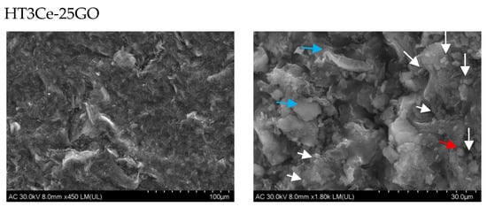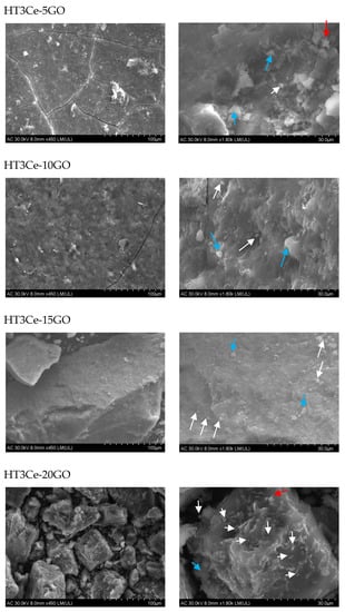 SEM images of the HT3Ce-xGO composites (left: low magnification; right: high magnification), with different aspects of the grain surfaces indicating polymorphic (blue arrows), irregular “ovoidal” (white arrows), or cubic (red arrows) structures.