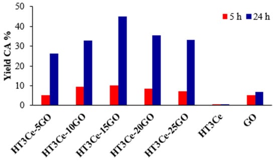 The yields of CA obtained with the investigated catalysts, namely HT3Ce-xGO (x = 5, 10, 15, 20, 25 wt. % GO), HT3Ce, and GO.
