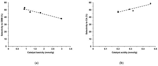 Selectivity to DBM after 24 h reaction time vs. catalyst basicity (a) and selectivity to CA after 24 h reaction time vs. catalyst acidity (b) for the HT3Ce-xGO composites in the Knoevenagel condensation of benzaldehyde with diethylmalonate.