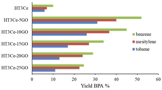 Catalytic results of the HT3Ce-xGO composites containing different concentrations of GO (x = 5, 10, 15, 20, 25 wt.% GO) in the one-pot oxidation–Knoevenagel condensation cascade reaction performed in different solvents: toluene, mesitylene, and benzene.