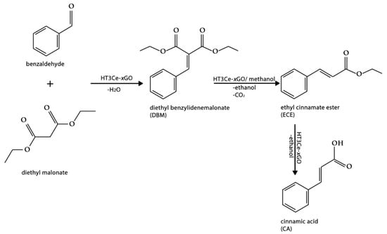All the Knoevenagel reactions were performed in a 100 mL stirred flask under reflux conditions at a temperature of 160 °C for two different reaction times, i.e., 5 h and 24 h. The catalytic activity of both GO and HT3Ce solids was also tested in the Knoevenagel condensation.