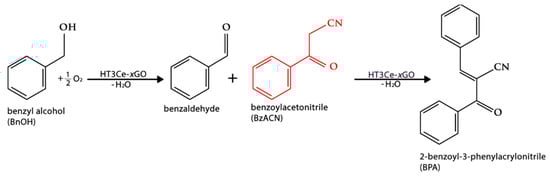HT3Ce-xGO composites exhibited a bifunctional catalytic behavior and could promote aromatic alcohol oxidation/Knoevenagel condensation in a stepwise way. From the already existing information in the open literature [59], low yields of oxidation products were obtained when polar solvents, such as acetonitrile, methanol, and ethanol, were utilized. Therefore, three different non-polar solvents were used for the current reactions, namely toluene, benzene and mesitylene.