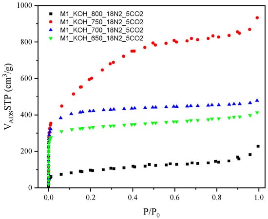 The textural properties of all samples were compiled in Table 1. In case of samples M1_650_18N2_5CO2, M1_700_18N2_5CO2, M1_750_18N2_5CO2, higher surface areas and pore volumes were obtained with increasing activation temperature. However, for sample M1_800_18N2_5CO2 the tendency is the differing, as observed in Table 1. The largest BET surface area (2075 m2/g) attained the M1_750_18N2_5CO2 carbon. In the other hand, the most microporous material with the micropore volume of 0.53 cm3/g were M1_700_18N2_5CO2 carbon.