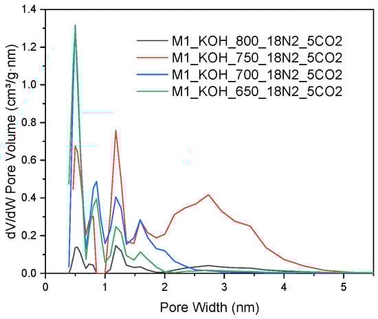 Taking into account an analysis of pore size distribution, more comprehensive information can be found regarding the structure of the adsorption over tested materials. In order to investigate the relationships between the pore size of the studied carbons and a temperature of activation process, an analysis of the size distribution of the activated carbons based on the N2 adsorption was performed. The pore distribution shown in Figure 2 directs for the fact that all samples in addition to a relatively well developed microporosity indicates the advanced mesoporosity as well. The used method provides information on the porosity for pores in the range from 0.35 to 300 nm, depending on the used adsorbate. However, in Figure 2 only pores up to 5 nm are presented, as there were no larger pores in the tested activated carbons.