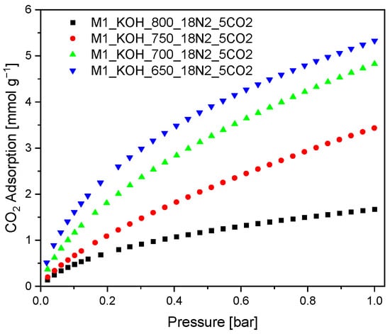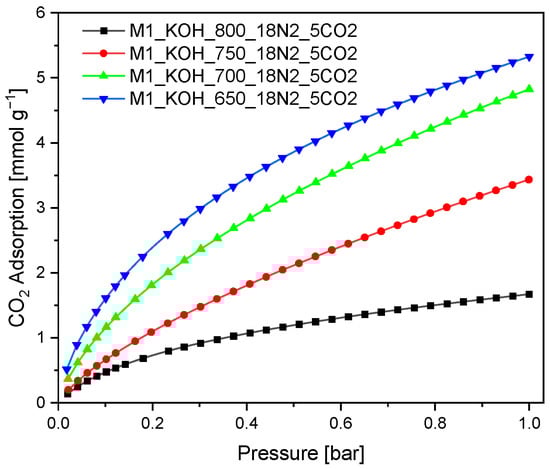 It was evidenced, that the CO2 adsorption capacity at temperature 0 °C increased along with decreasing carbonization temperature. These results are surprising because they are contrary to the literature reports [43], where the CO2 adsorption efficiency increases along with increasing: specific surface area, total pore volume as well as micropore volume. Therefore, it can be concluded that in the case of studied activated carbons the key role is played by pores with diameter in the range from 0.3 to 0.6 nm with ignoble participation of the larger pores.