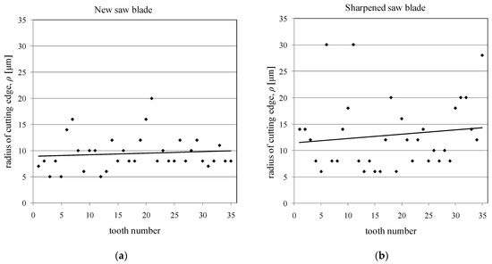 The obtained images from each tooth of both saw blades analysed were examined. The results of the analyses carried out to determine the cutting edge radii are presented in Figure 3. In Figure 3b, which shows the results for the sharpened saw blade, there are noticeable outliers from the overall point cloud. These much larger values of the cutting edge radii could be caused by excessive tooth wear during the preceding cutting process, tooth damage during saw blades installation and removal in gangs, or teeth damage during the sharpening process of saw blades. This damage, despite regenerative sharpening, causes a significant reduction in the sharpness of the cutting edge. An example of a tooth with a damaged cutting edge is shown in Figure 4b.