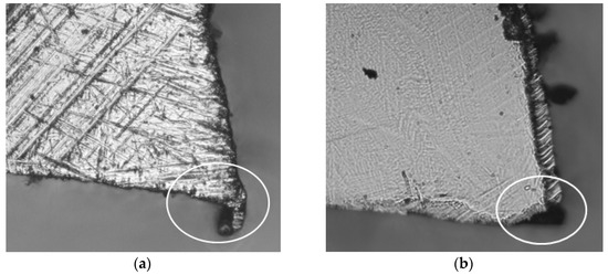 The larger cutting edge radii for the new blade (Figure 3a) were caused by the occurrence of burrs after the cutting edge grinding process (Figure 4a), which was the original sharpening process included in the blade manufacturing process. These burrs would probably have been removed during the initial stage of the sawing process, during the initial running-in period (the first part of the curve of natural wear) [42].