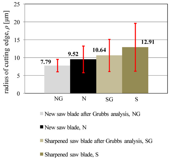 Both cutting edge failures for a sharpened blade and cutting edge burrs for a new blade can be regarded as coarse errors in the measurement of the cutting edge radii. Therefore, these values were eliminated from the analysis using the Grubbs test [41]. The elimination of coarse errors noticeably affects the mean values of radii and standard deviations. The mean values of the cutting edge radii along with the standard deviations for both analysed blades, both before and after coarse error elimination, are shown in Figure 5.