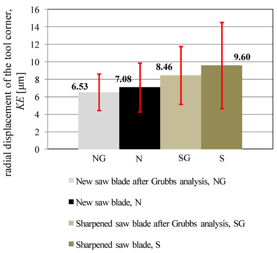 The determined values of the radial displacement of the tool corner KE based on Equation (1) are shown in Figure 6. Comparing Figure 5 and Figure 6, it can be seen that the trends of changes in values are very similar, as well as the proportions of standard deviations. This may indicate that these two parameters describing the level of cutting edge wear may be interchangeable. This means that it is enough to measure only one of them to have information about the other one. Also, there is no justification for measuring both these parameters simultaneously.