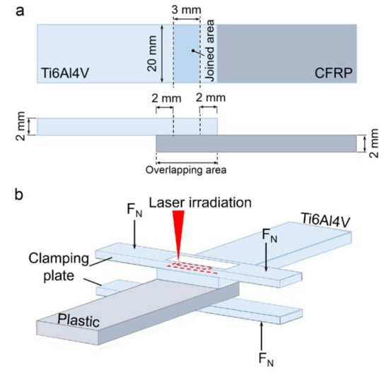 - Wang, H.; Feng, W.; Zhang, Z.; Guan, Y.; Zheng, H. Hybrid laser technique for joining of polymer and titanium alloy. J. Laser Appl. 2019, 31, 042017. [Google Scholar] [CrossRef]