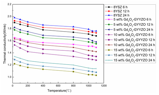 Figure 4 shows the thermal conductivities of the sintered bulks tested through the laser flash heating method at the temperatures from room temperature to 1100 °C. The thermal conductivity gradually decreased with the increase of Gd2O3 addition. The sintered GYYZO bulk with 15 wt% Gd2O3 had the lowest thermal conductivity of 1.04 W/(m k) at 1100 °C, which was much lower than that of 8YSZ with the thermal conductivity of 1.78 W/(m k) at 1100 °C and the reported 100% densified 8YSZ with the thermal conductivity of 2.3 W/(m k) at room temperature and 1.85 W/(m k) at 1000 °C [19]. The addition of Gd2O3 could reduce the thermal conductivity of YSZ further. With the prolongation of sintering times, the sintered bulks’ thermal conductivities increased gradually accompanied with the densification.
