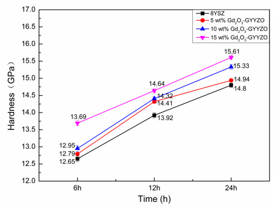 Figure 6 shows the hardness of the bulks sintered at 1650 °C for 6 h, 12 h, and 24 h. The sintered GYYZO bulks’ hardness increased with the increase of Gd2O3 addition and the sintering times. The 15 wt% Gd2O3-GYYZO bulk sintered at 1650 °C for 24 h had the highest hardness of 15.61 GPa, which was 5.4% higher than that of 8YSZ with the hardness of 14.8 GPa. The addition of Gd2O3 and Yb2O3 could improve the hardness of the composite material effectively. The high hardness could be attributed to two aspects. One was the densification. With the prolongation of sintering time, the densifications of the sintered GYYZO bulks were higher than 96%, which was close to full densification and could contribute to high hardness. The other was the composition’s strengthening. According to the literature, the hardness of Gd2O3 bulk was 7.9 GPa [33], the hardness of Y2O3 bulk was 6.0 GPa, and the hardness of 5YbSZ block was 12 GPa [34]. The theoretical hardness of 15 wt% Gd2O3-GYYZO can be simplified calculated to be 10.905 GPa according to the component’s hardness in 15 wt%Gd2O3-5 wt% Yb2O3-8 wt% Y2O3-ZrO2 (15 wt% Gd2O3-GYYZO). The tested hardness of the sintered 15 wt% Gd2O3-GYYZO bulk was 15.61 GPa. The tested hardness was 43.2% higher than the simplified calculated one, which was attributed to the good stabilization of ZrO2 in tetragonal structure by Gd2O3, Yb2O3, and Y2O3 as well as the solid strengthening.